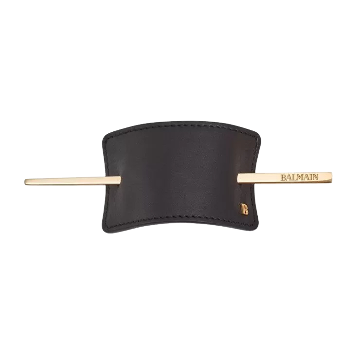 Чорна шпилька-затискач для волосся. Лімітована серія Hair Barrette натхнена фірмовим одягом колекції Balmain осінь-зима 2018. Шпилька-затискач для волосся, виготовлена ​​з натуральної шкіри наппа, доповнена шпилькою з позолотою 14k і прикрашена фірмовим логотипом. Ідеально підходить для популярної зачіски «кінський хвіст» або для створення високого укладання.