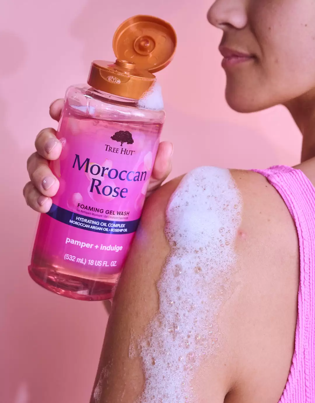 Moroccan Rose Foaming Gel Wash – гель для душу з розкішним ароматом марокканської троянди від бренду Tree Hut. М’яка формула збагачена комплексом зволожуючих та пом’якшуючих масел (авокадо, ківі, апельсина та олії ши), а також олією шипшини, яка покращує зовнішній вигляд і текстуру шкіри, надає їй природного сяйва. Олія аргани живить необхідними вітамінами, жирними кислотами та вітаміном Е. Засіб прибирає будь-які забруднення, пом’якшує, зволожує та живить шкірний покрив, дарує відчуття чистоти та комфорту, а також залишає неймовірний аромат на шкірі.